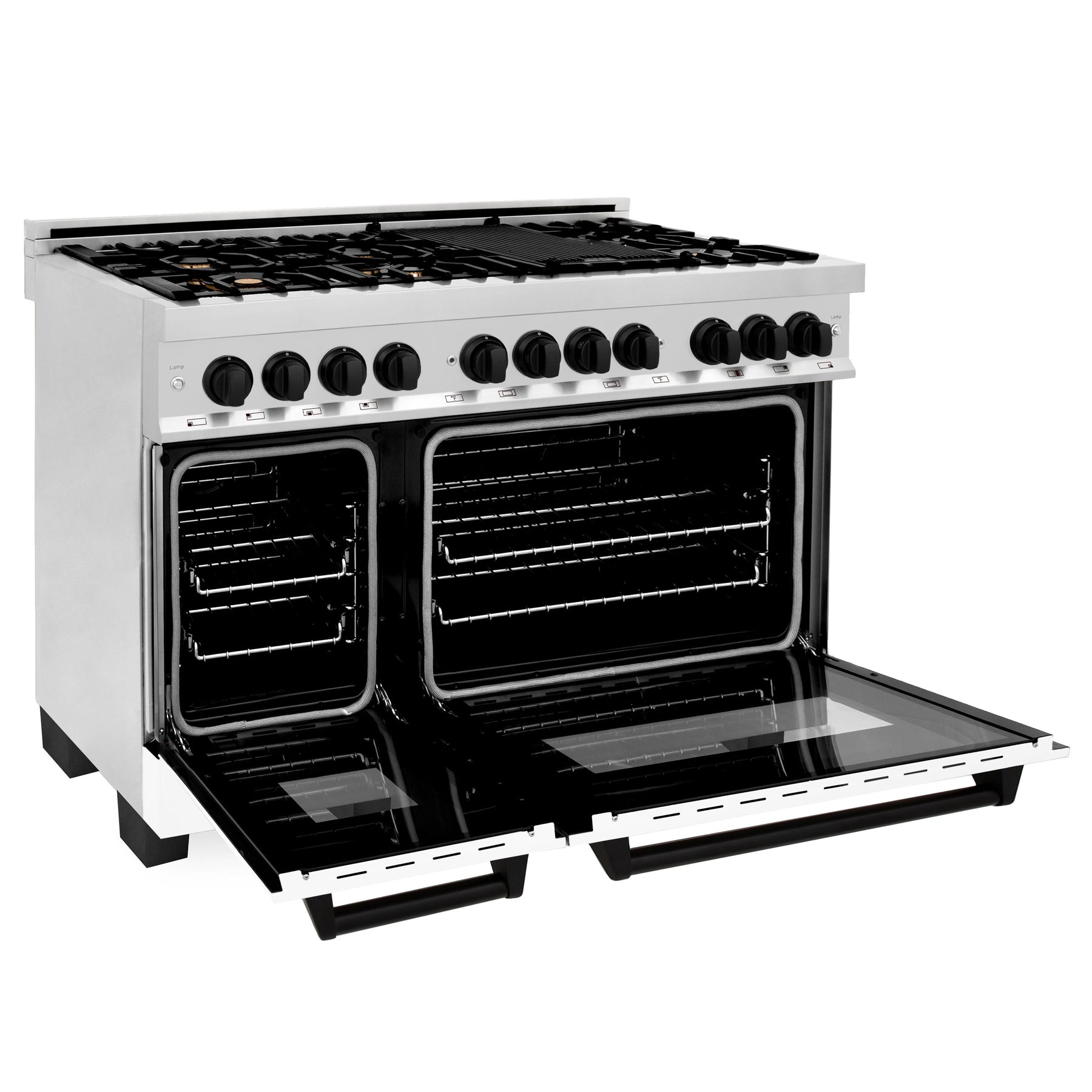This ZLINE Kitchen Autograph Appliance Package has a powerful stainless steel 48" Dual Fuel Range and 48" Range Hood - all with eye-popping Matte Black Accents!